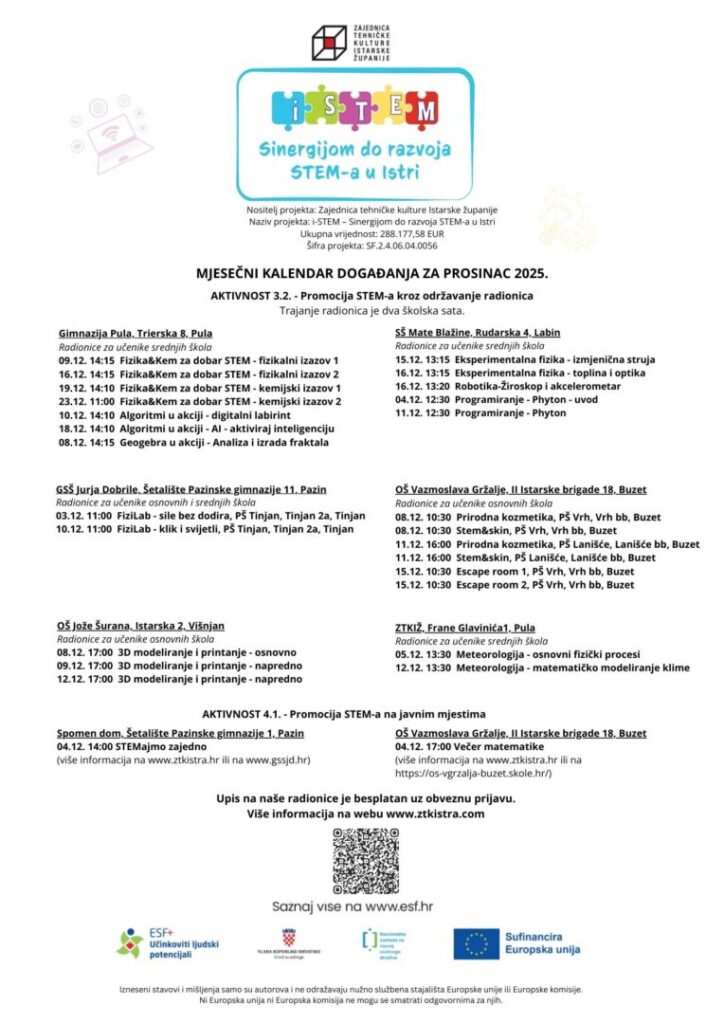 · STEMajmo zajedno – 04.12.2025. od 14 sati (Spomen dom Pazin, Šetalište pazinske gimnazije 1, Pazin) – u suradnji ZTK IŽ i Gimnazije i strukovne škole Jurja Dobrile Pazin