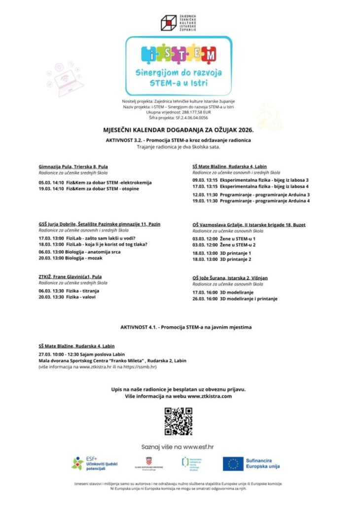 Zajednica tehničke kulture Istarske županije, u sklopu projekta „i-STEM – Sinergijom do razvoja STEM-a u Istri (SF.2.4.06.04)“, otvara vrata novom ciklusu besplatnih radionica! Pozivamo sve učenike osnovnih i srednjih škola da nam se pridruže i kroz praktičan rad, igru i najmoderniju tehnologiju istraže fascinantan svijet znanosti i tehnike.